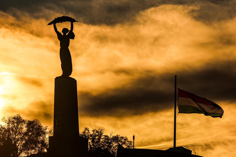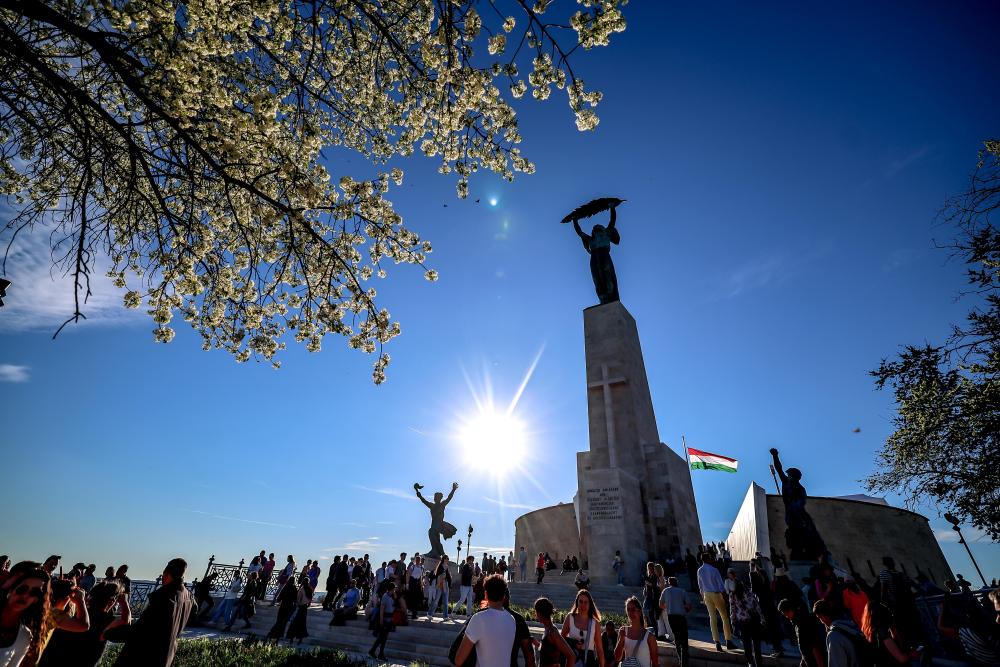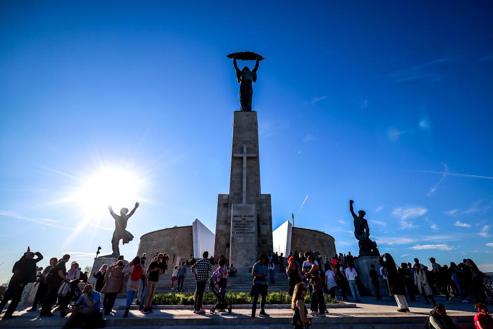 这是4月5日在匈牙利布达佩斯拍摄的重新树立的解放女神像。