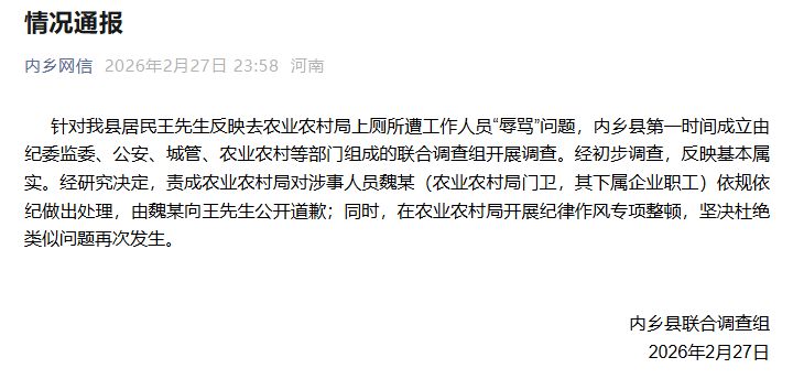 据“内乡网信”微信公众号2月27昼夜深音尘,内乡县麇集访问组发布情况通报称,经初步访问,反应基本属实。涉事东说念主员魏某为县农业农村局门卫,其下属企业员工。责成该局对魏某依规依纪作念出解决,由魏某向王先生公开说念歉。