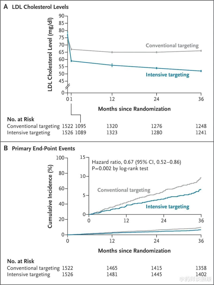 盘问的主要复合至极包括心血管厌世,非致死性心梗,非致死性卒中,任何血运重建或不显露型心绞痛入院。在流程3年的随访后,靶向强化降脂组的上述复合至极的发生率为6.6%,而通例降脂组主要复合至极发生率为9.7%。
