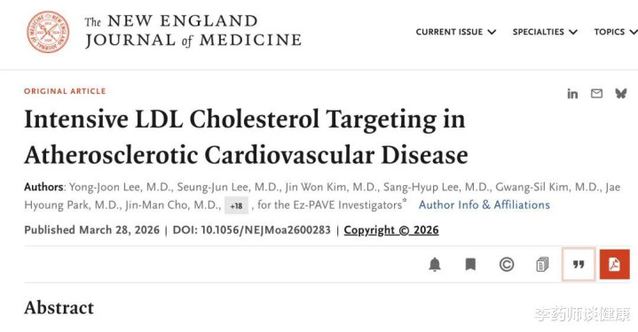 这个低密度脂卵白1.4mmol/L的适度标的,关于咱们中国东说念主来说,是否雷同适用,强化降脂药物调治又是否弥漫安全呢?一项近日同步发布在ACC.26 好意思国腹黑病学会年科学大会和新英格兰医学杂志(NEJM)上的韩国新盘问,约略不错给咱们以启发。