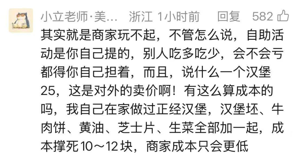 雇主暗示,自助活动本是为了引流,店内汉堡正价25元一个,女子每次吃十几个再加上小食,我方早已耗损。雇主承认其时未下架自助却拒客是辞别,当今已下架该活动,但认为女子发帖指令公论,还凭空汉堡不行口等实质,给我方带来负面影响。